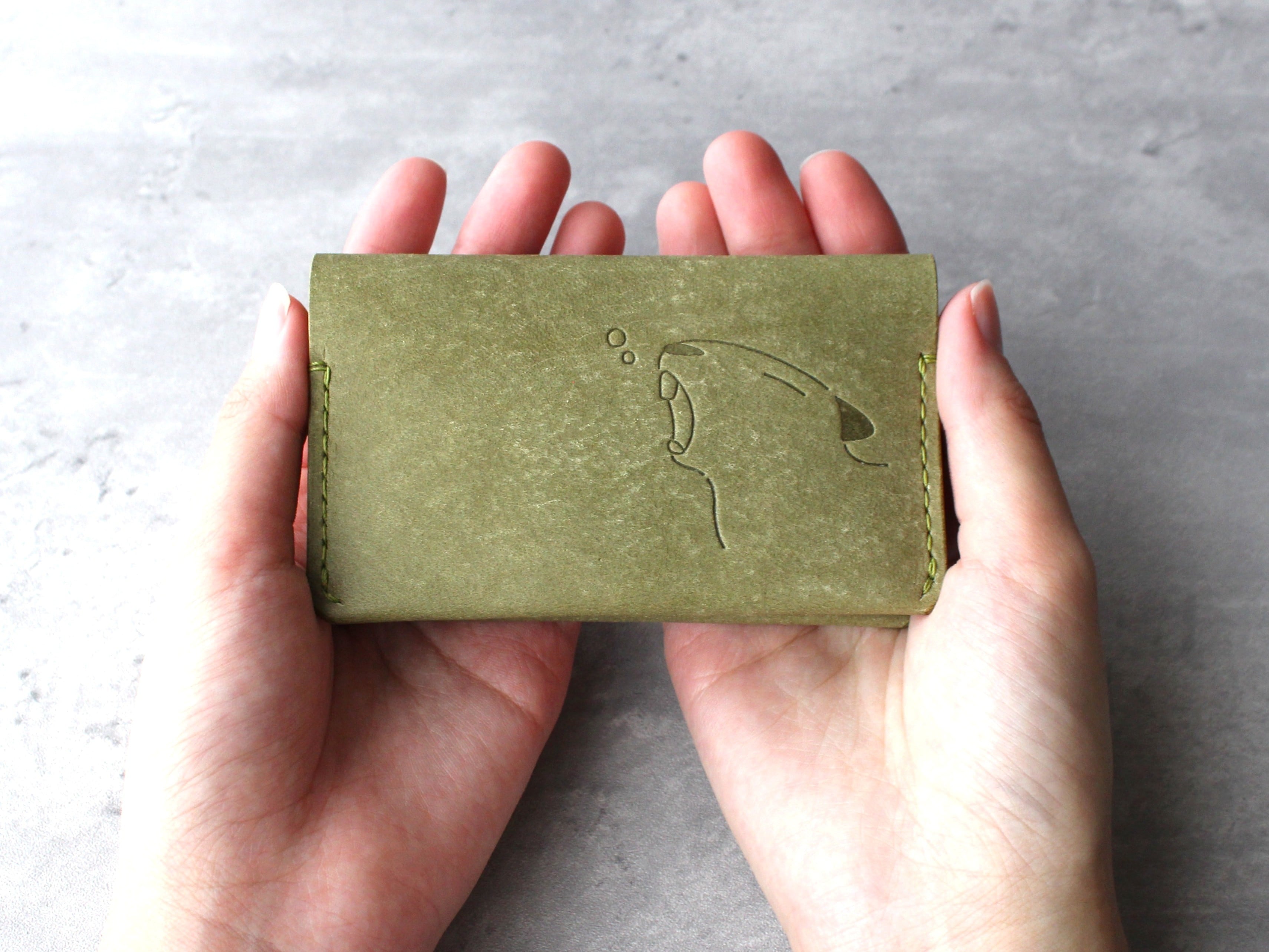 お仕事のおともに、カピバラはいかがですか? 新生活の始まりに、そっと寄り添うカピバラの名刺入れです。 はじめましてで緊張する名刺交換。 焦りながらも手にとった名刺入れを見ると、そこにはあくびをしたカピバラがいる。 その気の抜けた表情に、どこか和やかな気分になりませんか。 名刺入れの形は、ビジネスシーンでも使いやすいシンプルさを残しつつ、角を丸くしてやわらかい雰囲気に仕立てました。 これからお仕事で頑張りたい自分用にも 新生活が始まる方への就職祝いにも 派手過ぎず、でも遊び心のある名刺入れを選んでみるのはどうでしょう。 ■推奨収納枚数■ 各ポケットに名刺15枚程度 (通常サイズ 9.1㎝×5.5㎝の名刺の場合) これ以上に収納することもできますが、出し入れしにくくなることもあります。 ーーーーーーーーーーーーーーーーーー ギフトにもぴったりな名入れ刻印承ります! ◇刻印OK◇ 大文字A~Zの26種類 数字0~9の10種類 空白 のみ ◇刻印NG◇ 小文字a~z . (ドット) 記号 など このアイテムへの名入れ刻印は《最大12文字》です。 購入時の備考欄に希望文字を記載してください。 名入れ刻印のオーダーは、完成まで1週間~2週間程度のお時間をいただいております。 急ぎ対応をご希望の場合はお気軽にお問い合わせください。 ーーーーーーーーーーーーーーーーーー ■カラー■ 革3種類&ステッチ(糸)8種類からお選びいただけます。 ・革 1.グリーン 2.ダークブラウン 3.ブラック ・ステッチ(糸) a.ピンク b.イエロー c.グリーン d.ターコイズ e.ブルー f.ブラック g.ブラウン h.ダークブラウン カラーが分かりづらいようでしたら、お気軽にお問い合わせください! ■サイズ■ 縦7cm、横11.5cm、厚さ1.5~2cm程度 ■使用している革について■ マヤ まだら模様に銀スリ加工を施したスクラッチレザーで、独特な風合いをお楽しみいただけます。 とても経年変化の強く、使いこむうちにマットな雰囲気から艶のある雰囲気になります。