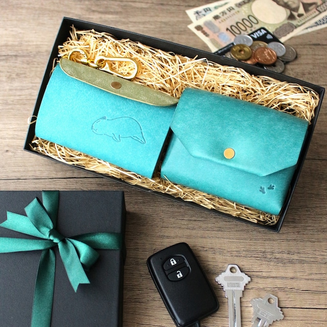 【カスタムOK】お出かけが楽しくなるカピバラのギフトセット コンパクト財布&スマートキーケース ターコイズ
