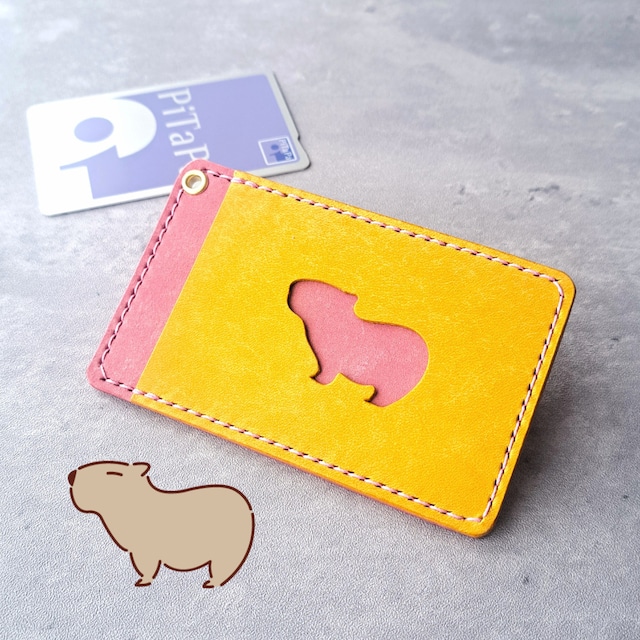 小窓のカピバラがかわいい!シンプルなレザーパスケース【イベント展示カラー】イエロー×ピンク