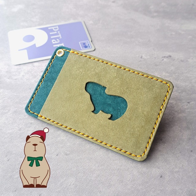 小窓のカピバラがかわいい!シンプルなレザーパスケース【イベント展示カラー】グリーン×ターコイズ