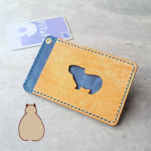 小窓のカピバラがかわいい!シンプルなレザーパスケース【イベント展示カラー】ブルー×イエロー