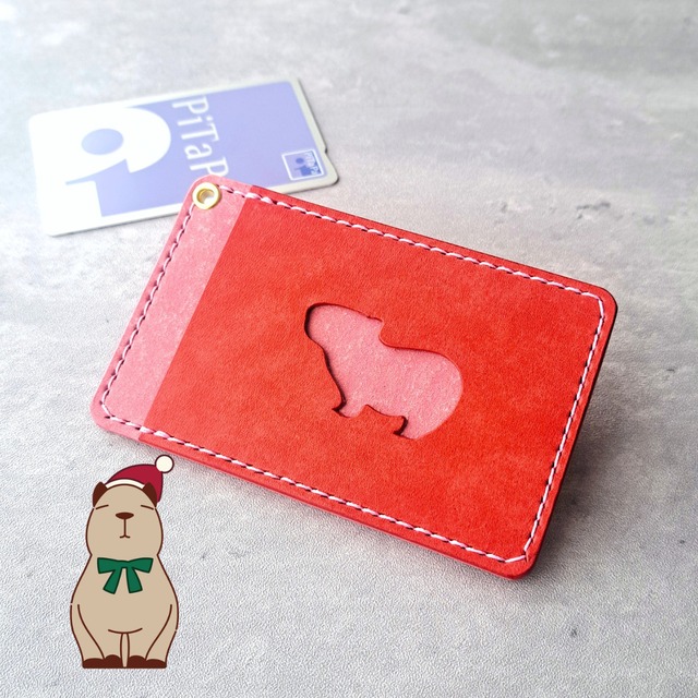 小窓のカピバラがかわいい!シンプルなレザーパスケース【イベント展示カラー】レッド×ピンク
