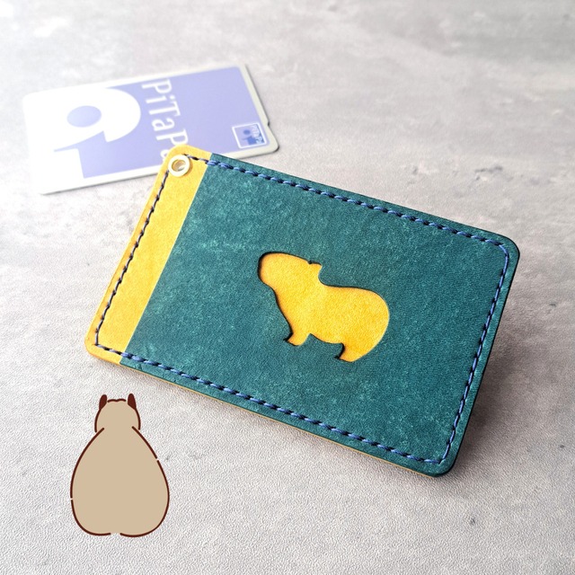 小窓のカピバラがかわいい!シンプルなレザーパスケース【イベント展示カラー】ターコイズ×イエロー